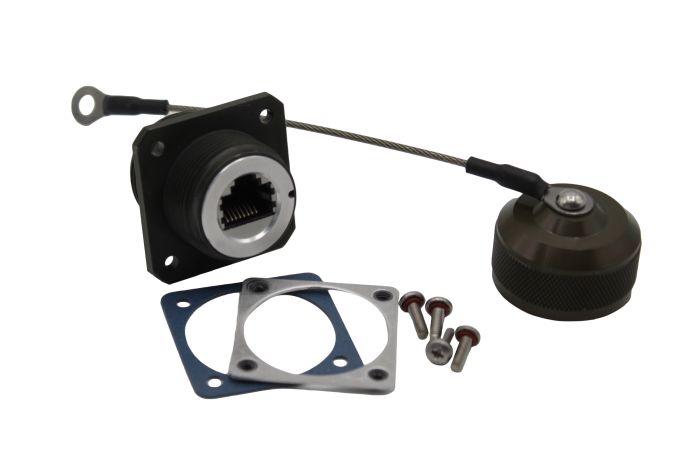 Home / Black Anodised Aluminium Flange Mount Connector with Cap and Mounting Hardware - Unshielded - Cat6a Female