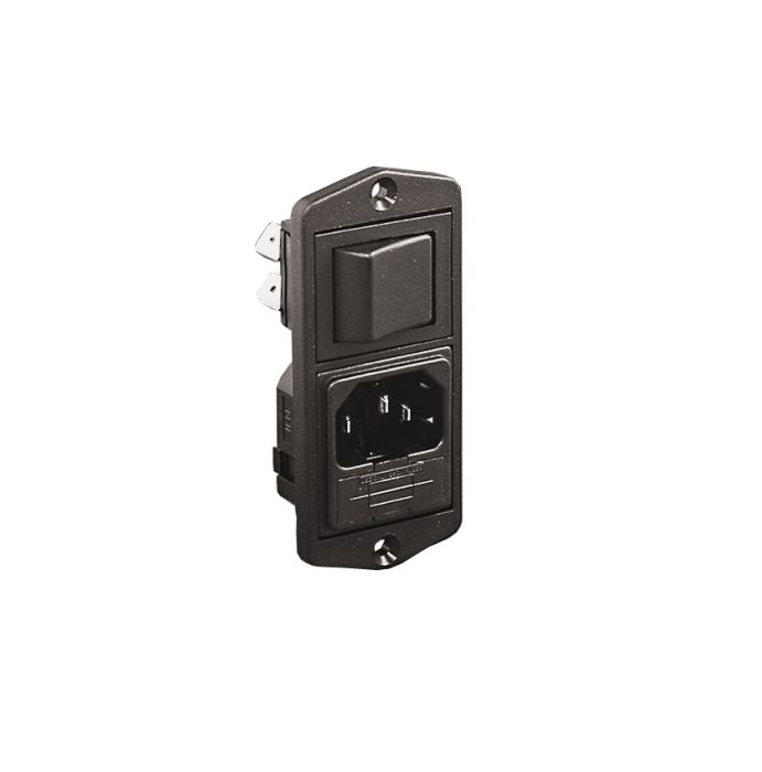 Vertical Power Entry Module 81.5mm Top Fixing Flange Mount C14 Cold Condition Inlet Integral Twin Fused (PF0033) 6.3mm Tab Termination A0420 Filter (4A PS26/A L/C v2) Double Contact Switch