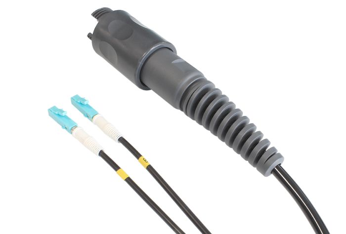 - A Terminated Plug Connector with a 2-Channel OM1 Outdoor Tactical Cable that breaks out in 2 independent cables (0.5m long) with LC Terminations - 25m Long Cable Assembly